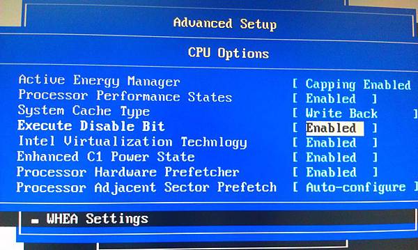 選擇Advanced Setup -> CPU Options -> Execute Disable Bit 設定為 Enabled... ->存檔,重開機。搞定