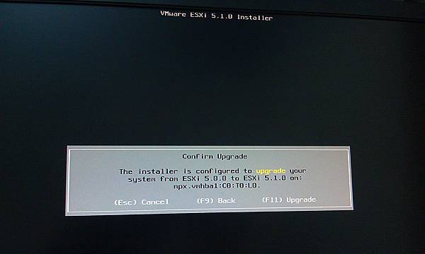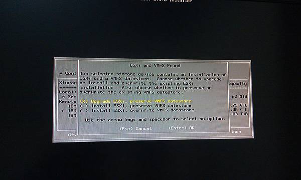 Step 2. 選擇更新ESX存放的位置,及更新或重新安裝方式。(在這裡請勿挑錯,挑錯也可以,按Esc or F9(Back) 就可以了)