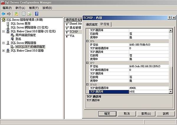所以必須在TCP通訊埠中輸入該Production DB 的通訊埠。(在此我也設定sql標準通訊埠為1433)