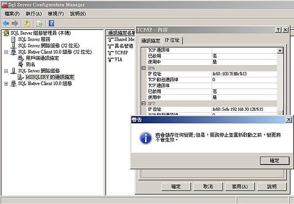 修改完畢後,別忘了要重新啟動mssql的服務,才可以啟用剛才所設定的Port喔。