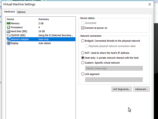 安裝完畢後,確認一下網卡是否為host-only mode,如果不是的話,就調整一下吧!