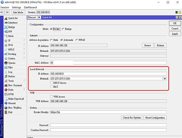 登入系統後,點選左上方Quick Set,即可設定RouterOS的IP及相關設定。