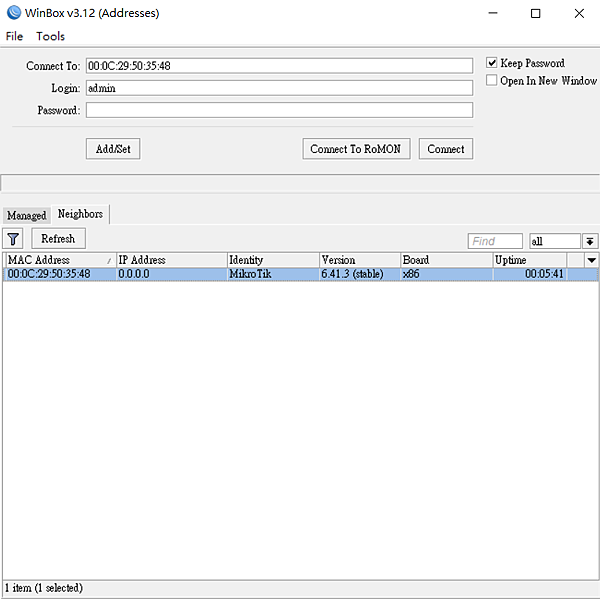 下載後打開它,由於RouterOS剛裝好會透過廣播方式去發送自己的所在區域,所以開啟WinBox後,就可以找到他