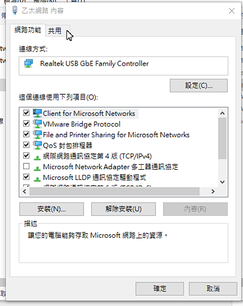 將有接上網路線的那個網卡點選右鍵,我們要將實際我們上網的網卡share給VMnet1使用
